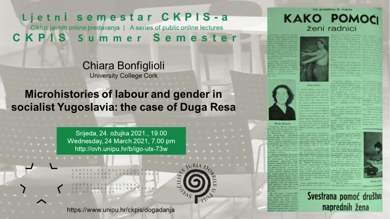 Chiara Bonfiglioli, istraživačica na projektu i predavačica rodnih i ženskih studija na Sveučilišnom koledžu Cork u Irskoj, nastupila je 24. ožujka 2021. u sklopu ciklusa javnih predavanja Ljetni semestar CKPIS-a. Na predavanju pod naslovom Microhistories of labour and gender in socialist Yugoslavia: the case of Duga Resa govorila je o vrijednosti arhivskih izvora za mikrohistoriju rada i roda na primjeru djelovanja Konferencije za društvenu aktivnost žena (KDAŽ) u Dugoj Resi, tamošnjoj industriji i općinskim tijelima od šezdesetih godina nadalje. Duga Resa jedna je od studija slučaja projekta Mikrosocijalizam.