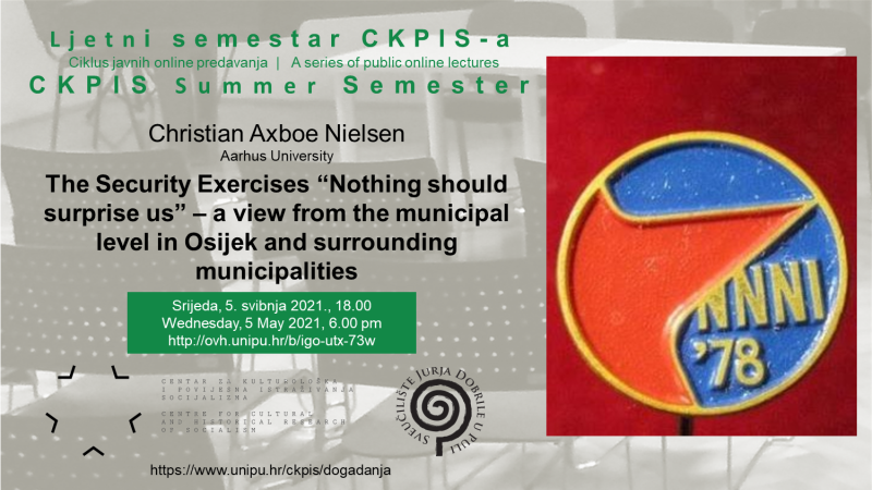 Christian Axboe Nielsen, istraživač na projektu i izvanredni profesor na Sveučilištu u Aarhusu u Danskoj, nastupio je 5. svibnja 2021. u sklopu ciklusa javnih predavanja Ljetni semestar CKPIS-a. Na predavanju pod naslovom The Security Exercises “Nothing should surprise us” – a view from the municipal level in Osijek and surrounding municipalities govorio je o sustavu općenarodne obrane i društvene samozaštite (ONO I DSZ) i akcijama Ništa nas ne smije iznenaditi (NNNI) te o primjeni toga modela civilne zaštite u Osijeku i okolici 1970-ih i 1980-ih. Osijek je jedna od studija slučaja projekta Mikrosocijalizam.