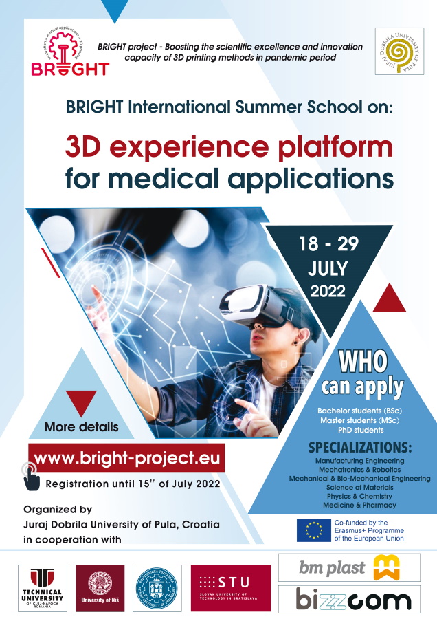BRIGHT International Summer School on: "3D experience platform for medical applications" is organized by Juraj Dobrila University of Pula (Croatia) in cooperation with BRIGHT consortium experts that are coming from different European Technical Universities (TU of Cluj-Napoca (Romania), TU Poznan (Poland), Univ of Nis (Serbia) and STU Bratislava (Slovakia) and two SMEs (BIZZCOM s.r.o. of Slovakia and B.M Plast d.o.o of Croatia) under the frame of ERASMUS KA 226 BRIGHT project.