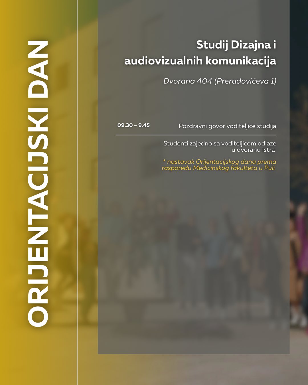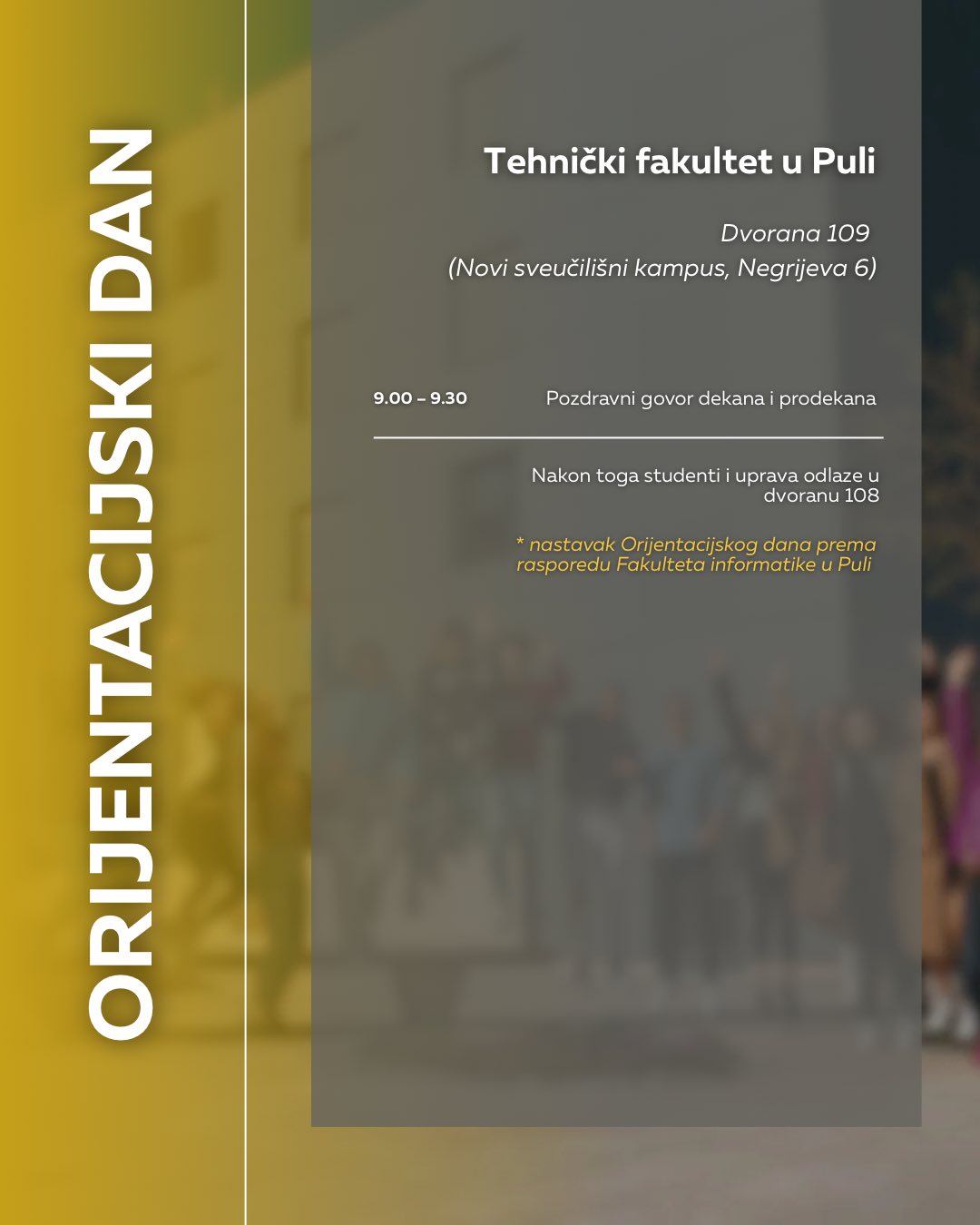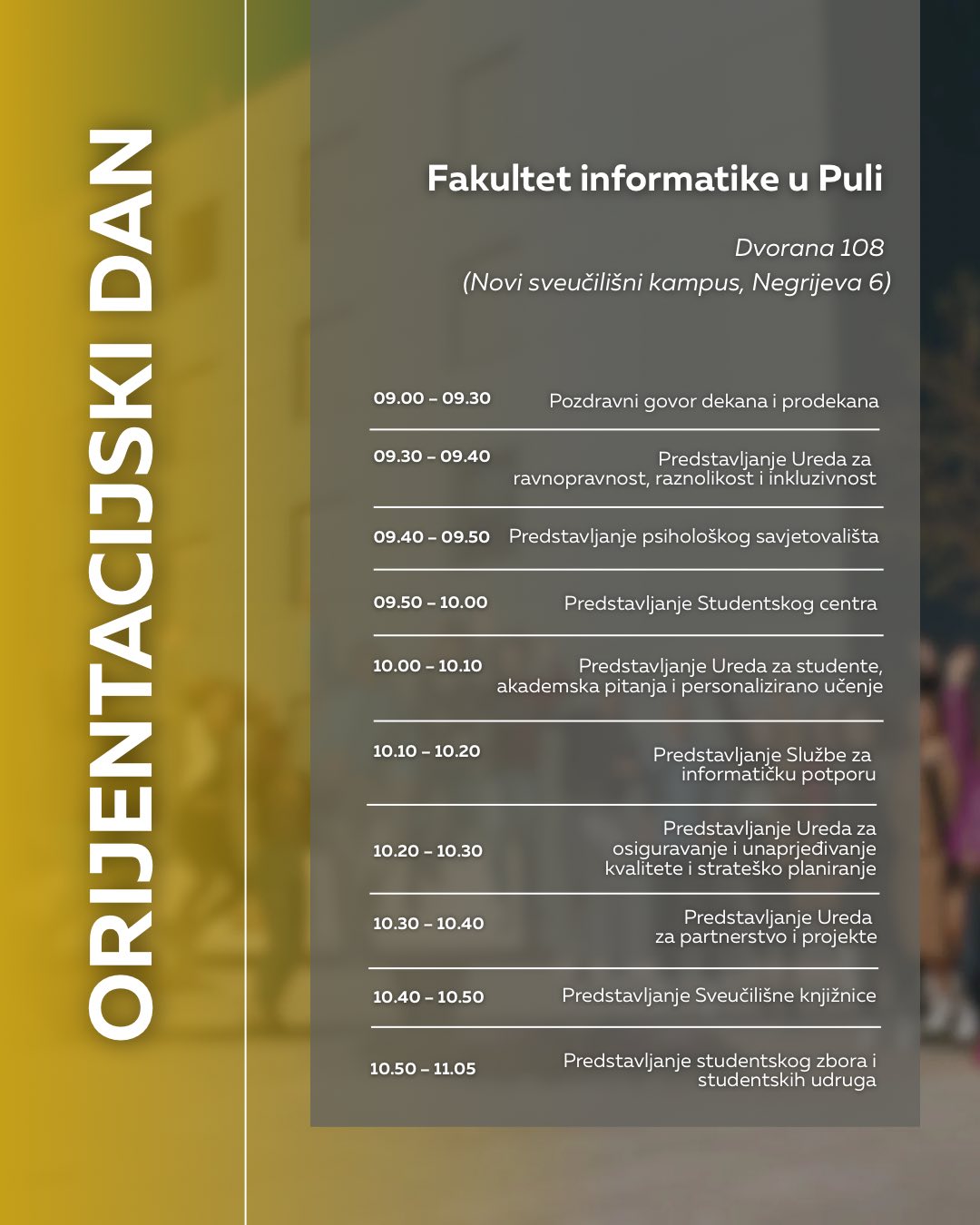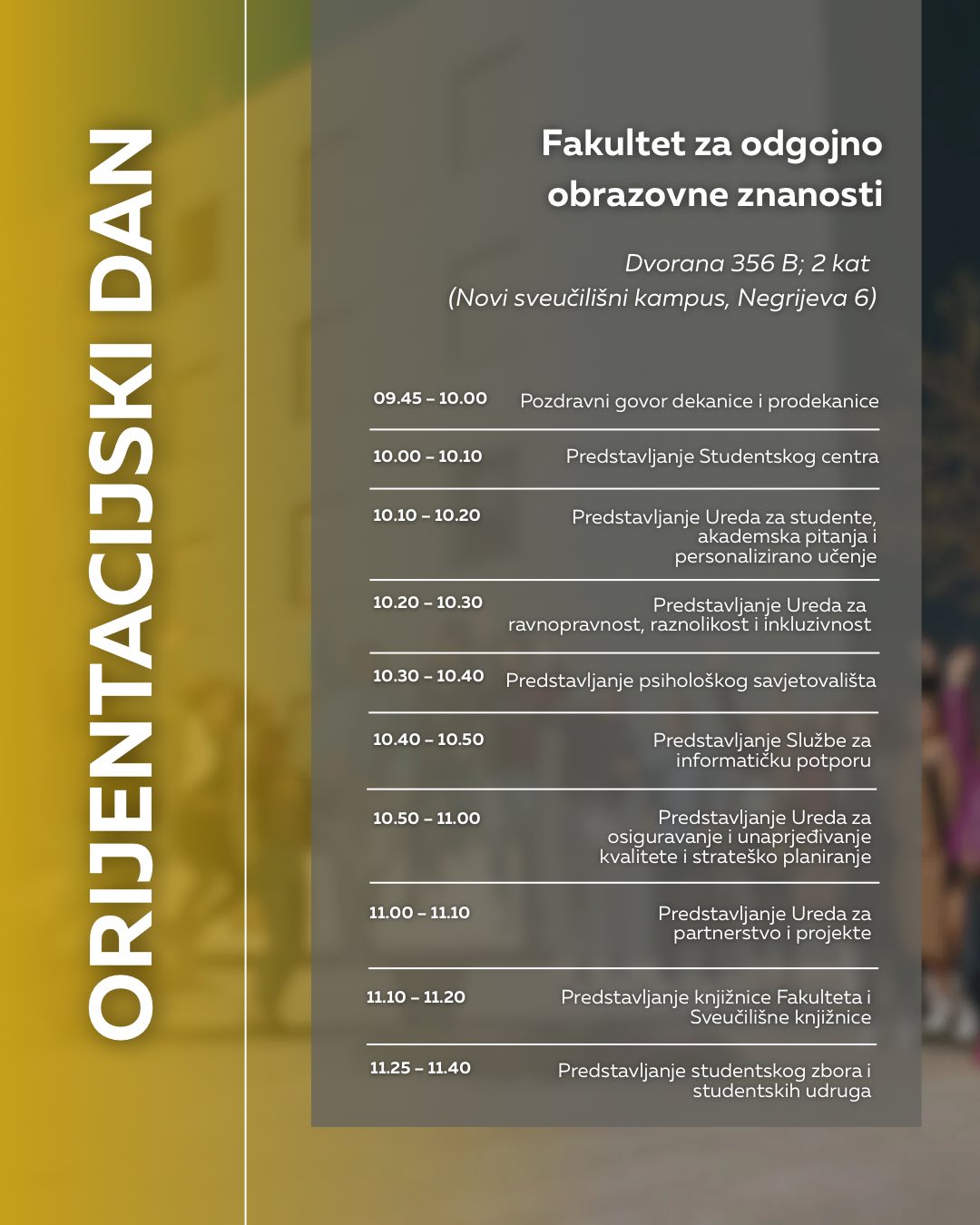 NAPOMENA: Obratite pozornost na adrese događaja, za pojedine fakultete Orijentacijski će se dan održati u novom kampusu na adresi Negrijeva 6, gdje se nastava tih fakulteta i izvodi.