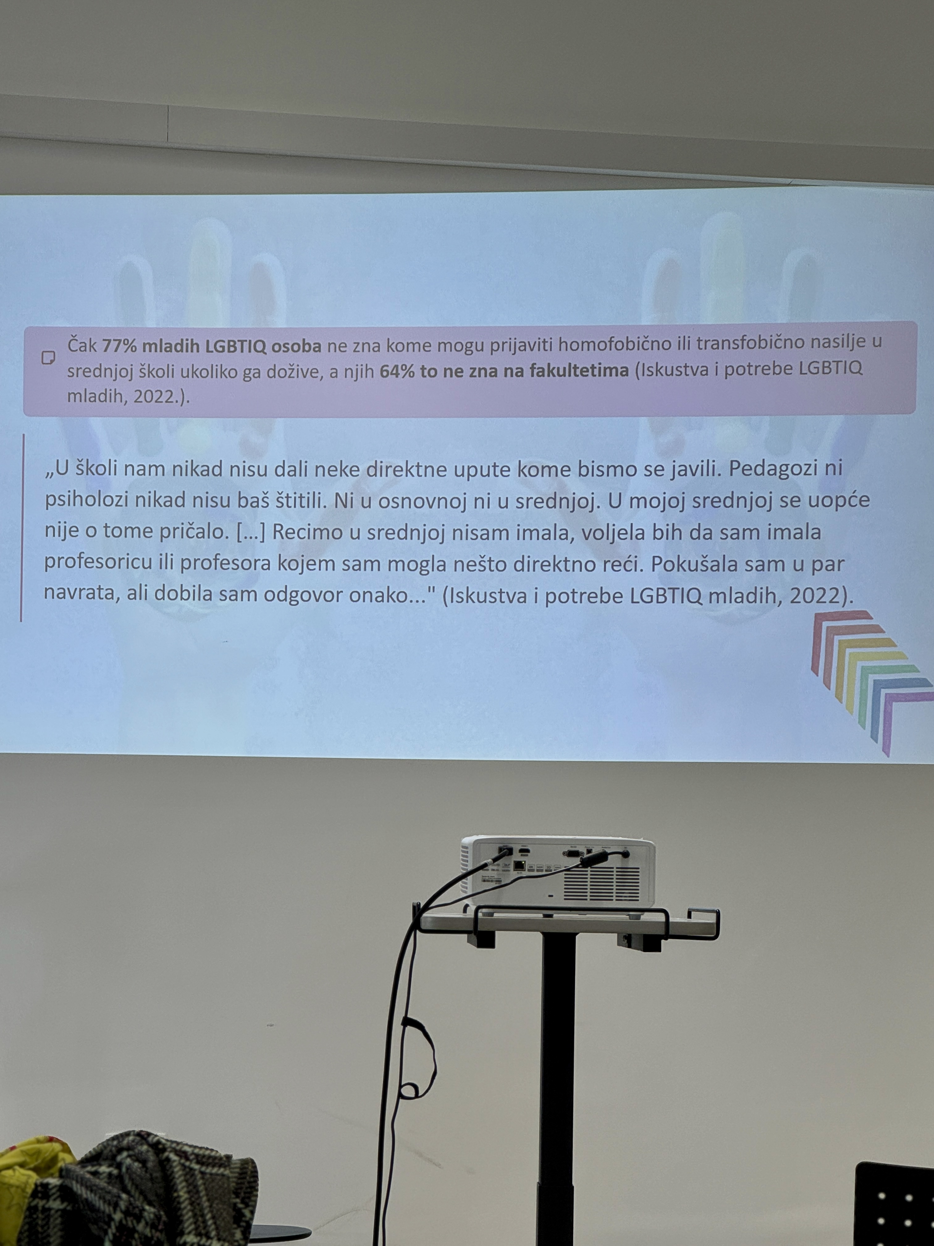 Edukacija je obuhvatila teme vezane uz LGBTIQ terminologiju i rodno uključiv jezik, uz poseban naglasak na prepoznavanje LGBTIQ-fobije te stvaranje inkluzivnog obrazovnog okruženja. Održana je u dva termina – jedan namijenjen studenticama i studentima, a drugi nastavnom osoblju.